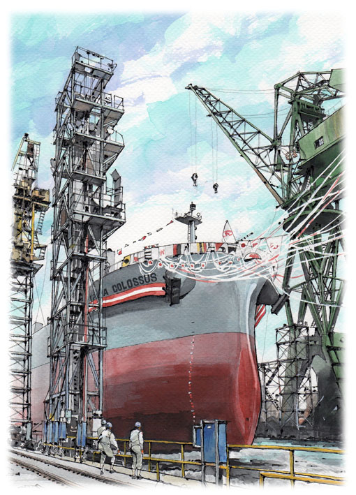 タンカーの進水式を初めて見に行きました。鉄物は何か魅力があります。A4サイズ。2011,01記。2010,12作画。